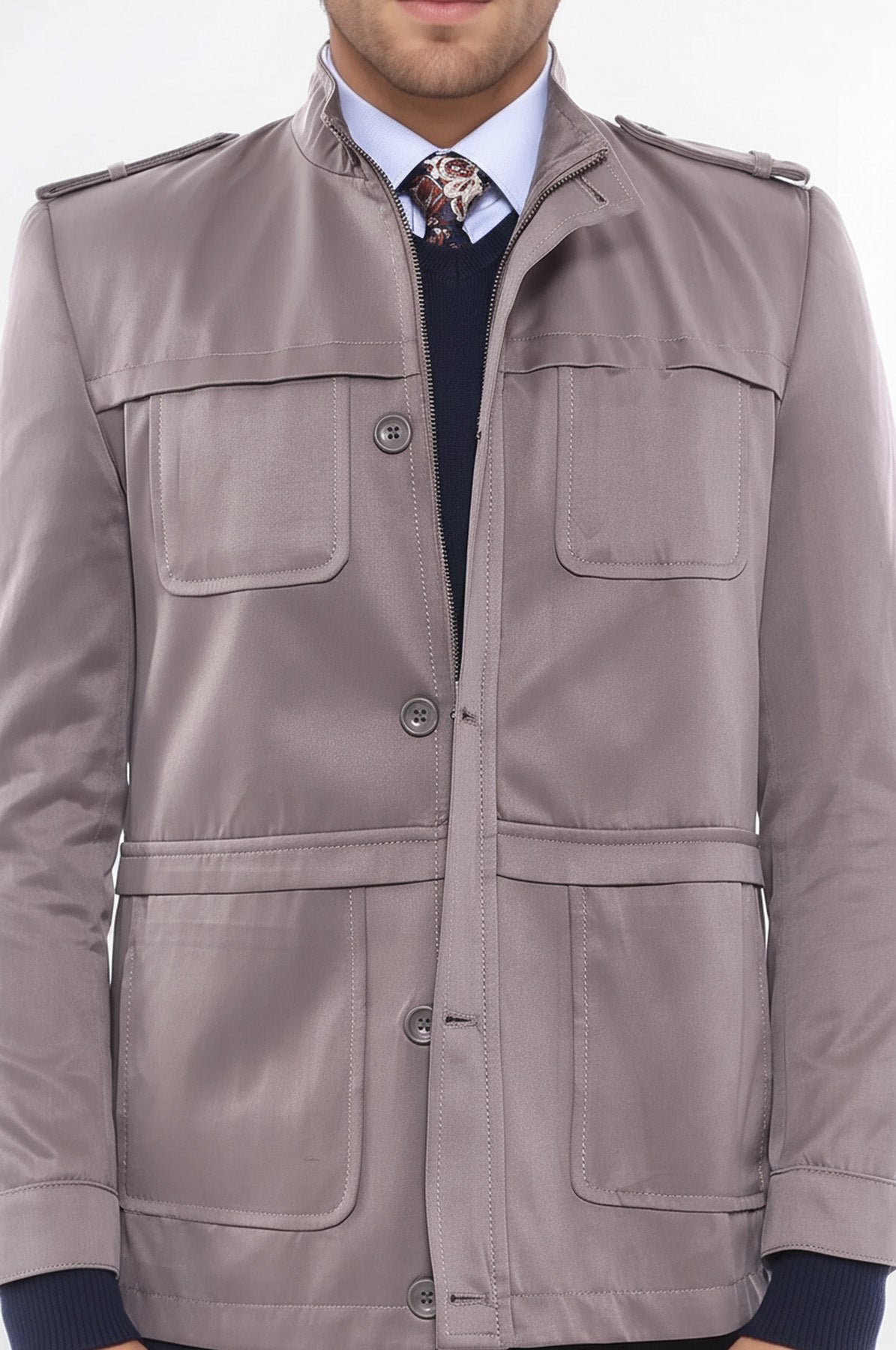 Our seasonal men's jacket model is a wardrobe star with its elegance, which is designed to suit all combinations designed with simplicity for every style. Quality fabric and a bright texture with a thin marginal details with a marginal air, while matching body size lines are among the most stylish outerwear part of men's style. The jacket designed specifically for the charismatic gentlemen of the business world dominates the style that can be worn at any time of the day with space-time limitation, with the weight of the beige color, the light shiny fabric texture and the stylish and classic-sports blend. Epaulette and collar details of the jacket highlighted the visual design, comfortable buttons are used in the foreground with comfortable wear. A quality model that will give gentlemen style with the harmony of classic and sports wear.