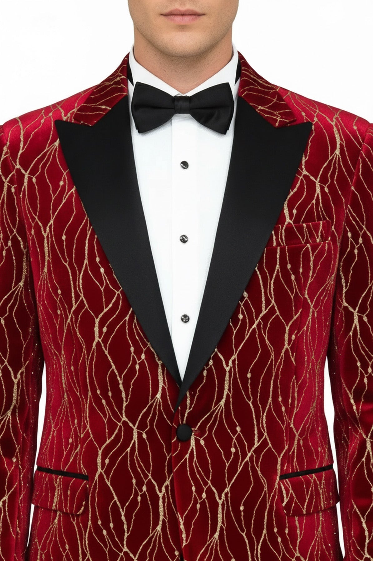 Patterned Burgundy Men Party Tuxedo Blazer - Wessi