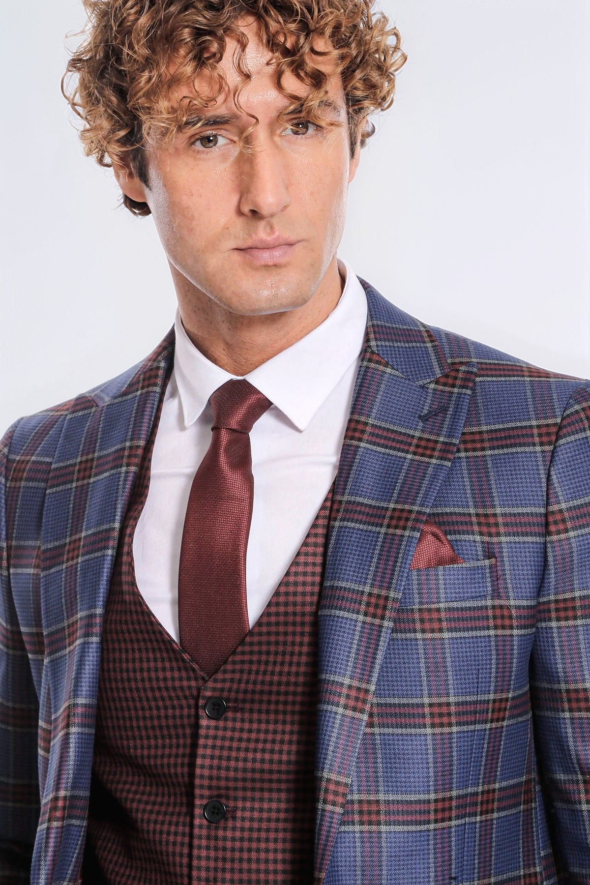 Slim fit suits have become increasingly popular in recent years, so wearing one can make a statement and show that you're up-to-date with the latest fashion trends. Because , slim fit suits are a more modern and stylish take on the classic suit. They are designed to fit closer to the body, creating a sleek and streamlined look that is both sophisticated and contemporary. This plaid suit with navy blue jacket and burgundy vest is a bold and stylish choice. With this suit, you can attract attention at any invitation or special event. The burgundy vest adds a bit of color and character to your suit, helping you get away from the ordinary. You can get a harmonious look with by adding a tie or bow tie in a matching color to your plaid suit.