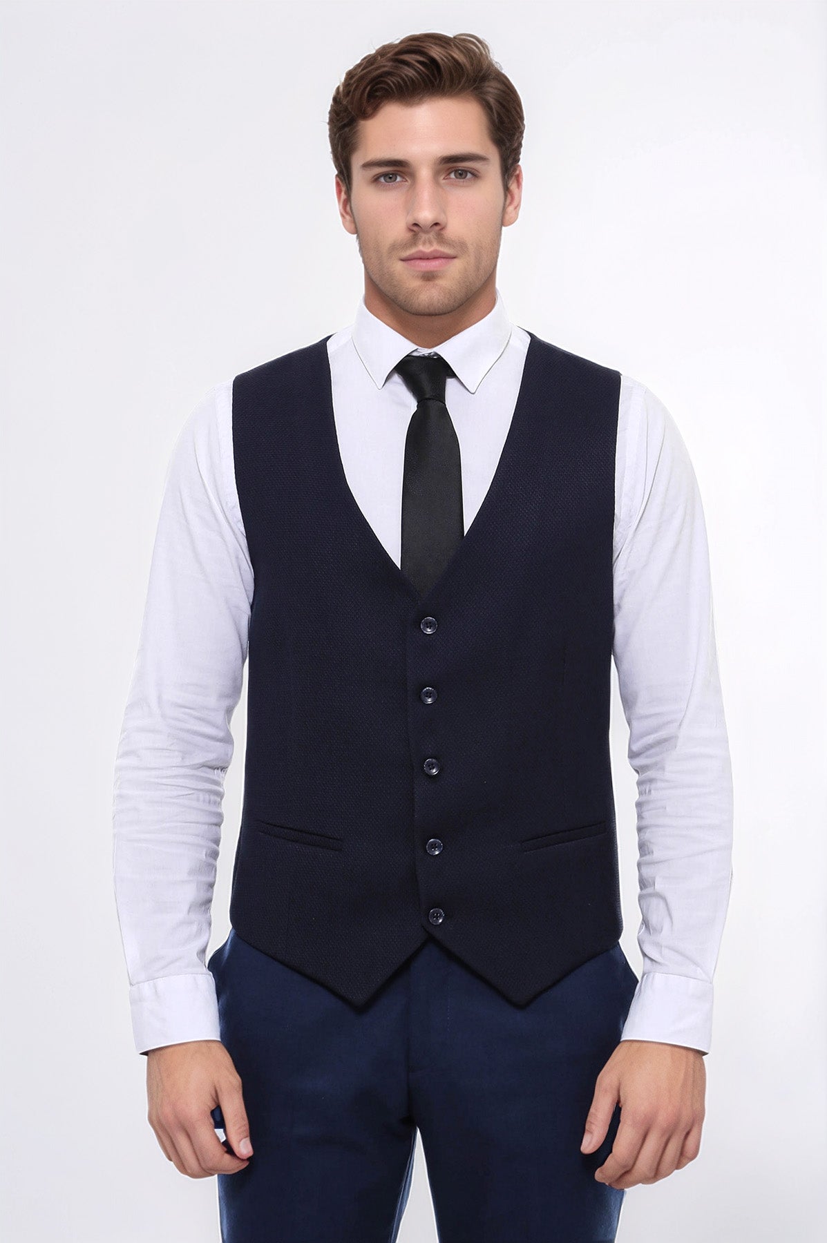 Upgrade your style with the Wessi Patterned Navy Blue V Neck Vest. Made with high-quality materials, this vest features a unique pattern and V neck design, making it a versatile addition to your wardrobe. Keep cool and look sharp in any occasion.