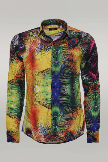 Are you tired of wearing the same old plain shirts to evening soirees? Look no further than this peacock patterned multicolor men's shirt. With its eye-catching design and slim fit, this shirt is sure to turn heads and make a statement at any event. Its unique design and slim fit make it perfect for dressing up for evening soirees, and its versatility allows for a variety of styling options. Upgrade your evening look with this statement piece and be the talk of the town.To complete the look, pair this shirt with dark jeans or black pants and black shoes. For a more casual look, try pairing it with white sneakers and light-wash jeans.