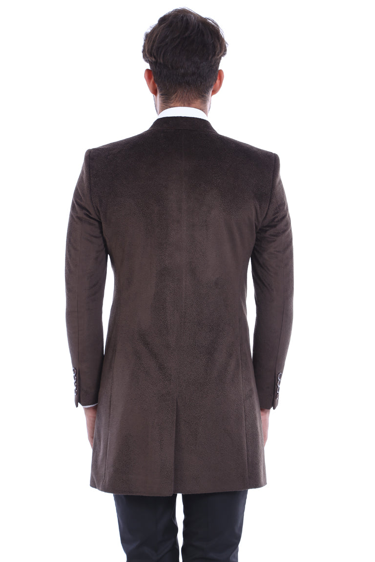 Our men's coat model is woven from brown cashmere fabric. It draws attention with its pointed collar, light color detail on the left chest area and collar pin. Oblique regular pockets make it easy to use. The slit on the back provides comfort in the seating arrangement. Slim fit and above the knee length emphasize your posture. You can easily wear it over a suit or jeans and be sure of your elegance.