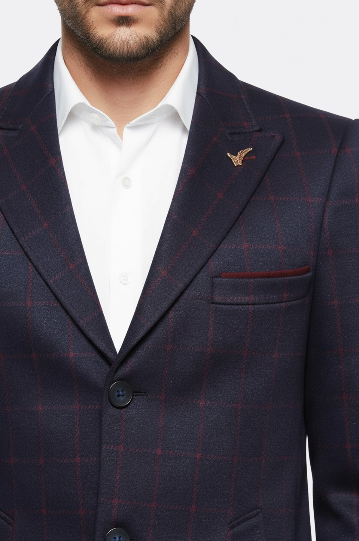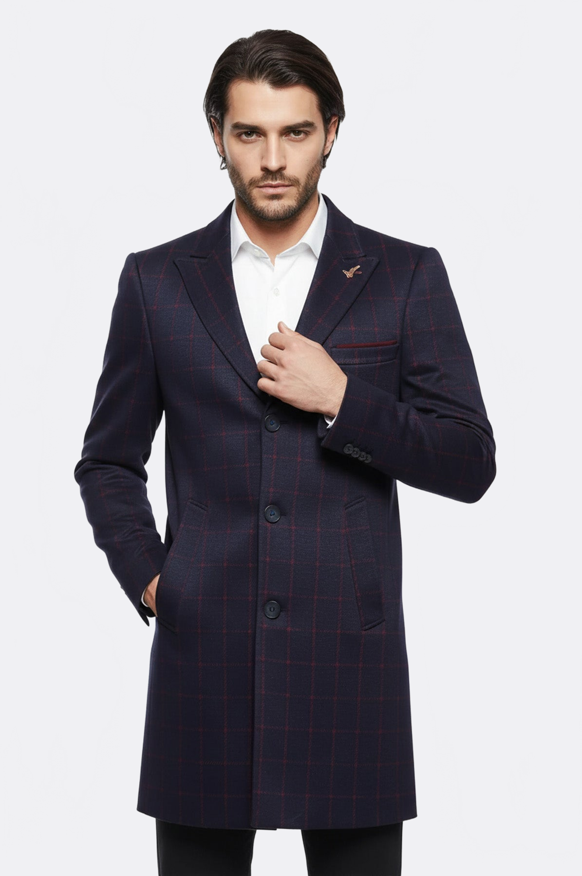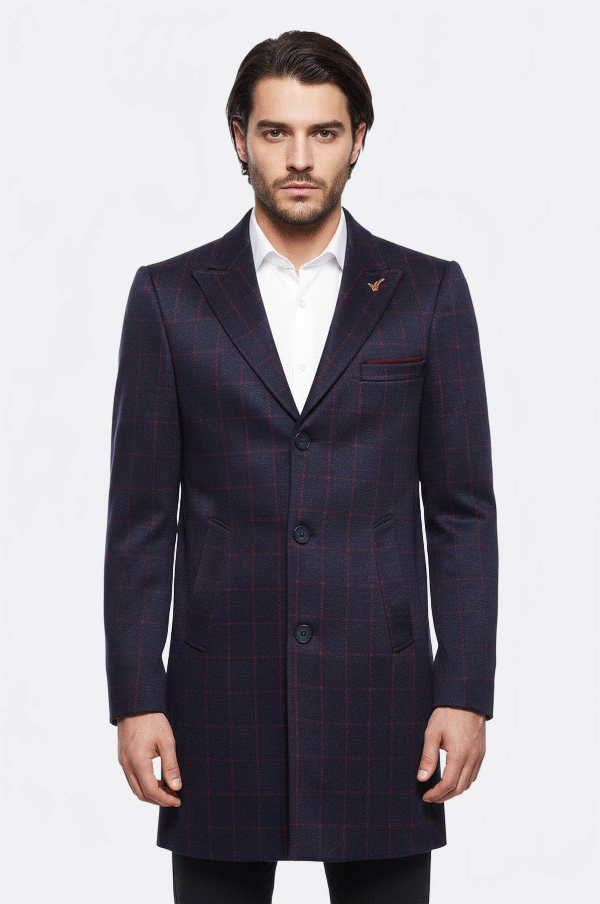 One of the winter clothing products that is heavy, serious, cool, attractive and stylish is coats. This model, which is a short coat model, has a plaid pattern consisting of red lines on the navy blue color. This coat model, which closes with three buttons, offers comfortable use. It will look good on you with its slim fit pattern. This coat model with cachet fabric has a single slit. Having a wide and pointed collar makes this coat more attractive.