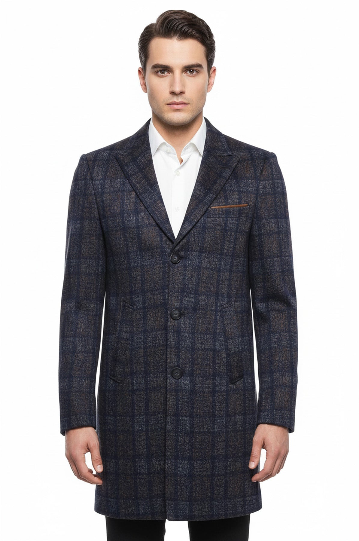 It is possible to find overcoat models, which are among the most popular men's classic clothing pieces, in the products of our brand. In this model, in which smoked color is used, a large plaid pattern is created using dark blue lines. The coat, designed with three buttons, also has pointed wide collars. In order to add color and revitalization to the model, a collar pocket was designed, allowing men to use pocket wipes.