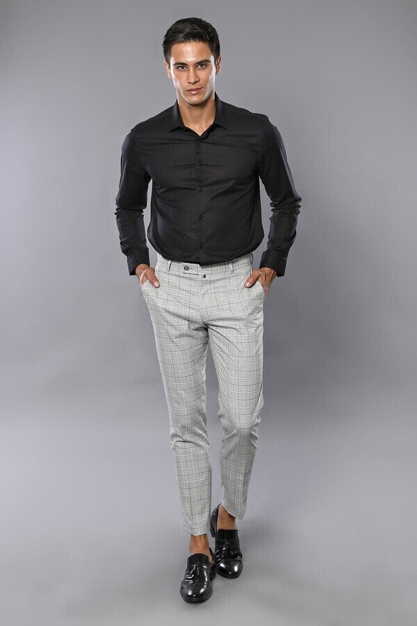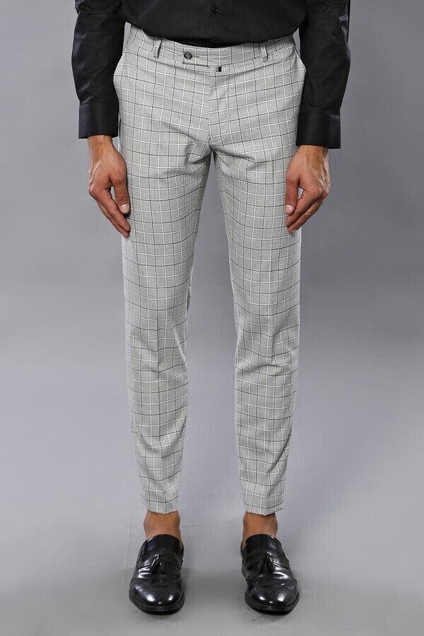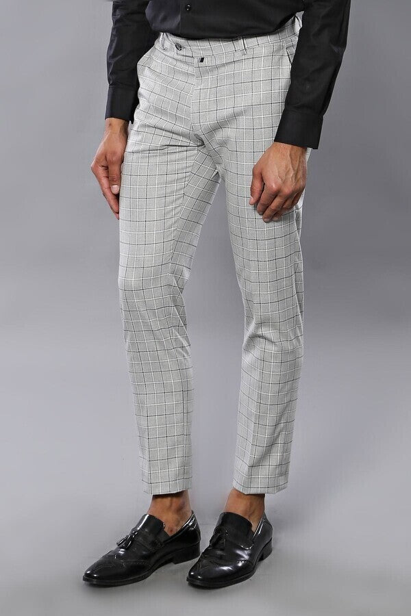 Plaid Slim-Fit Light Grey Men Trousers - Wessi
