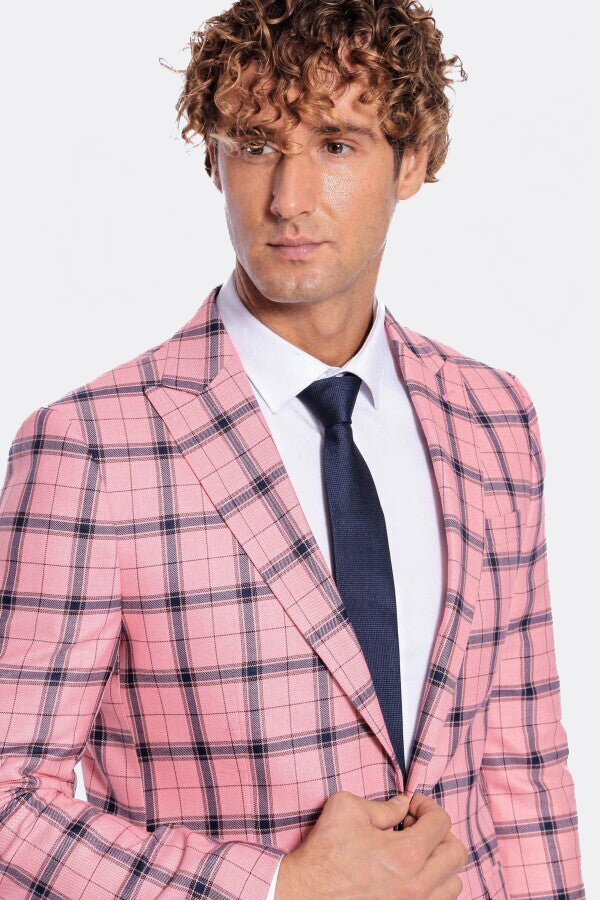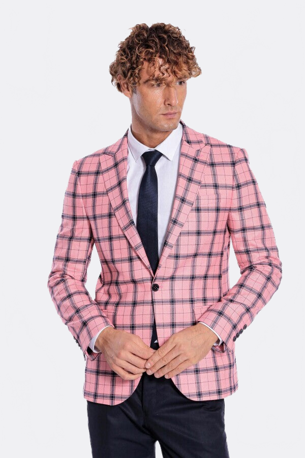 Plaid Slim Fit Pink Men Blazer - Wessi