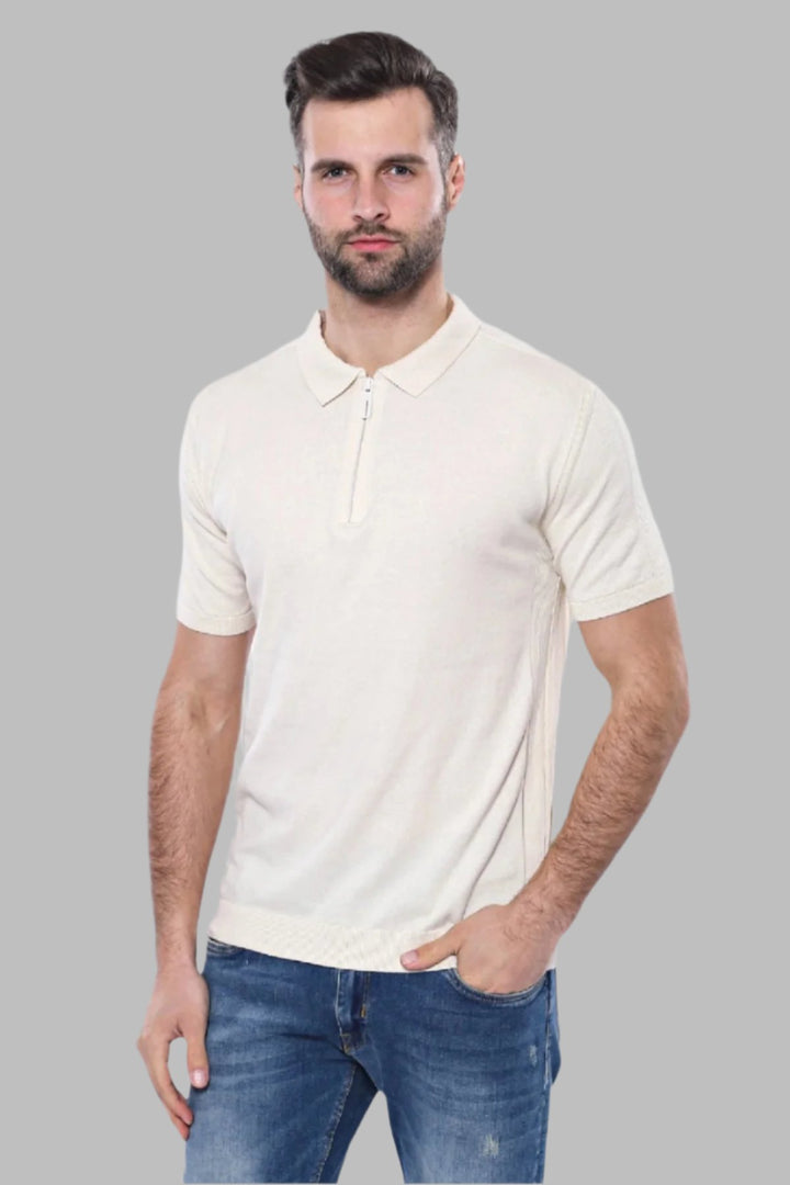 Polo Neck Plain Cream Knitted T-Shirt - Wessi