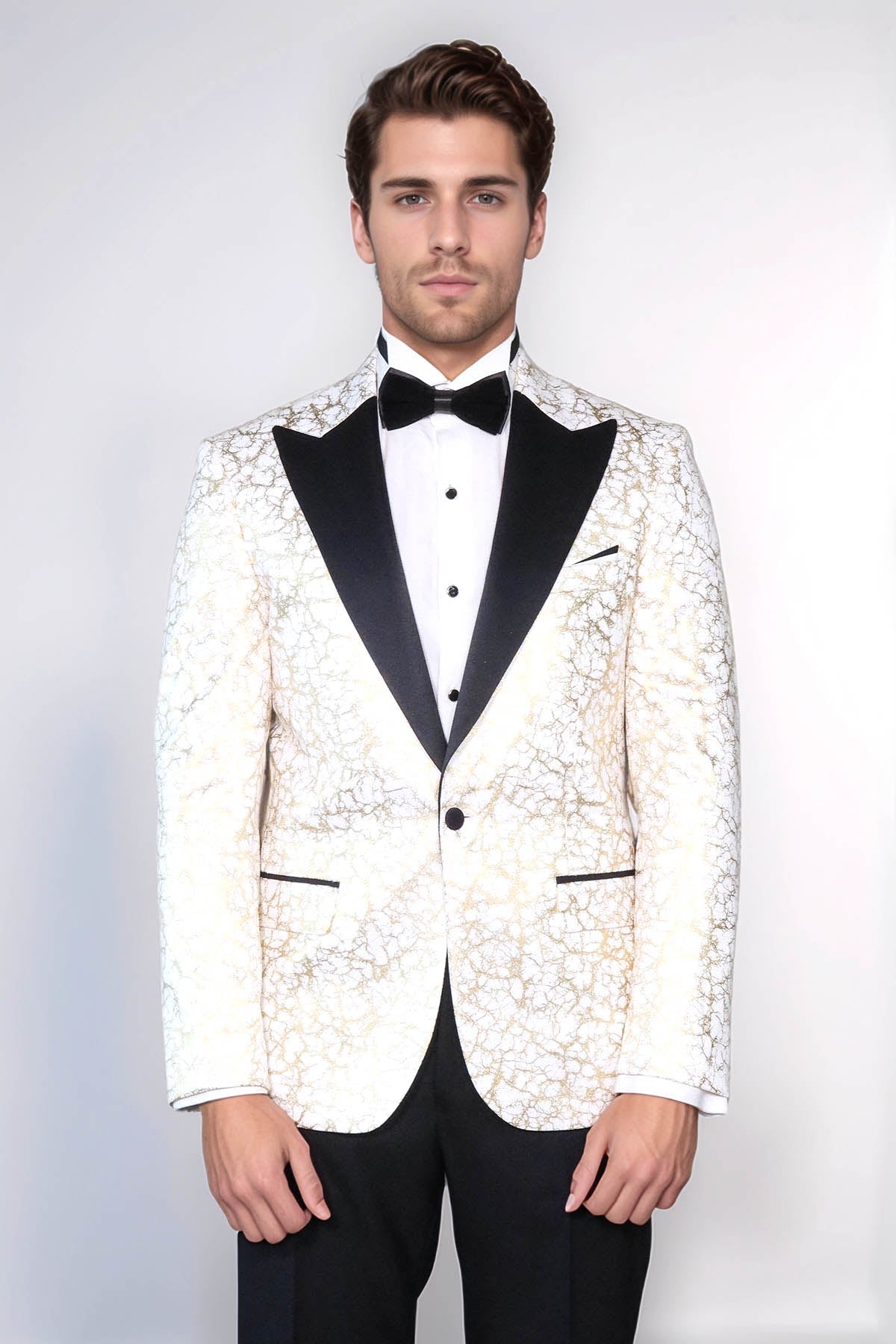 Expertly crafted by Wessi, the Root Pattern Peak Lapel White Men's Dinner Jacket exudes sophistication and style. Made with precision and care, its unique root pattern and peak lapel make it a stand-out piece for any formal event. Elevate your wardrobe with this elegant and timeless piece.