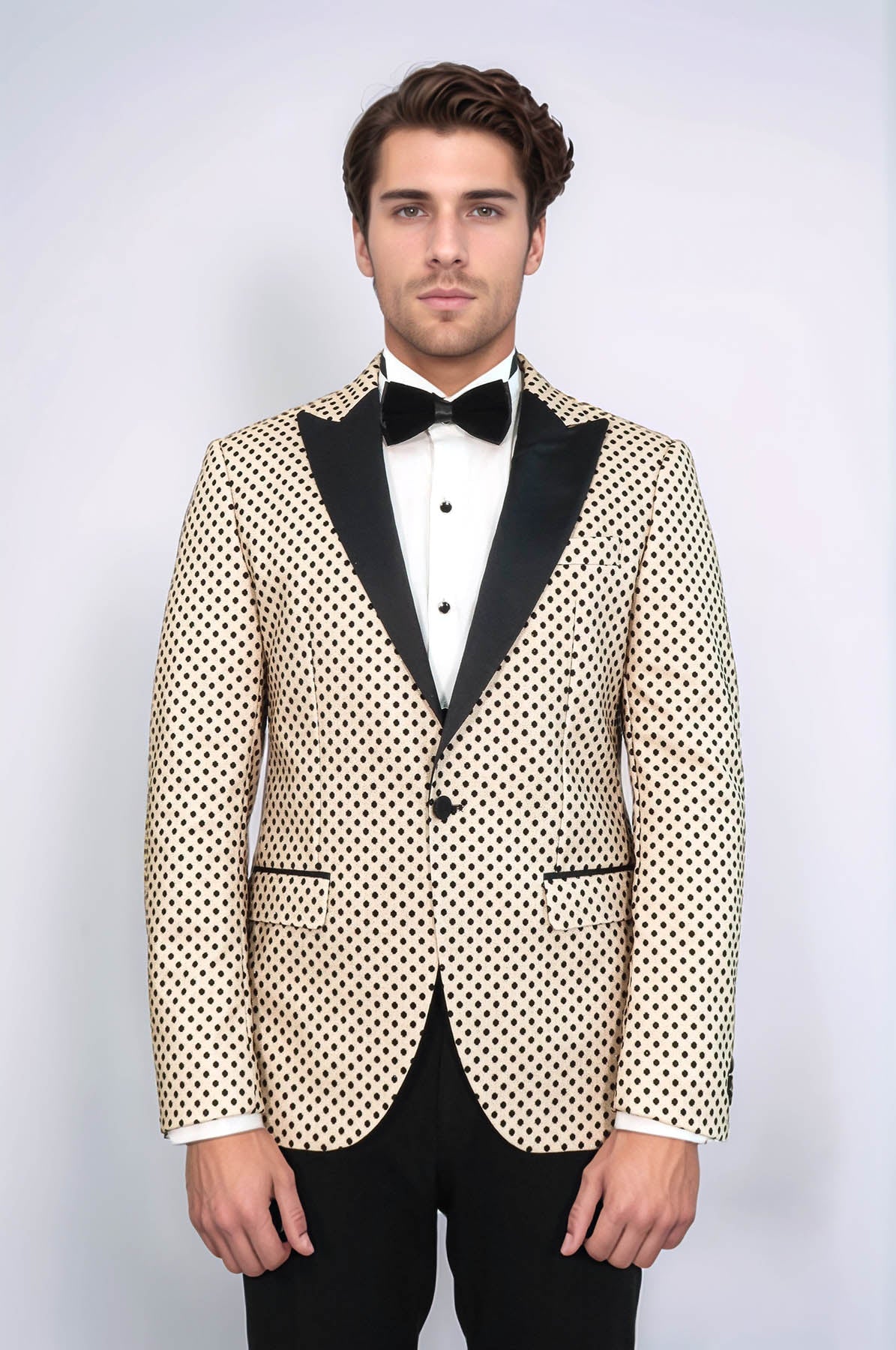 Elevate your men's party fashion game with our Sequin Dot Patterned Cream Men Wedding Tuxedo Blazer from Wessi. Make a statement with its slim fit and pointed collar, adorned with cream sequins that add a touch of sophistication and style. From family dinners to special occasions, this blazer will make you stand out in a tasteful and elegant manner. For a complete look, pair it with a boldly patterned pocket square or a stylish wristwatch. Alternatively, opt for a more understated aesthetic by pairing it with navy blue or black trousers. Upgrade your wardrobe and elevate any event with this luxurious tuxedo blazer.