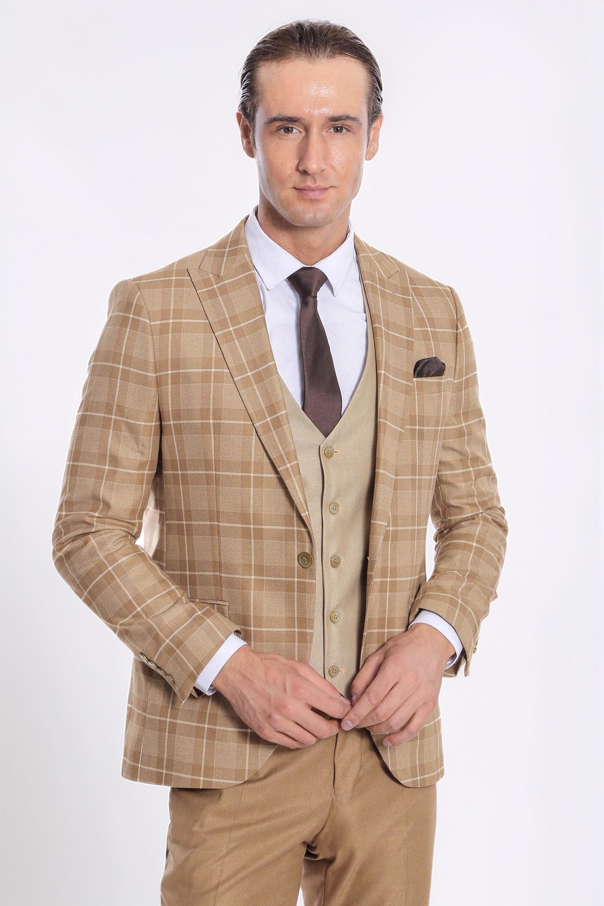 Whether you're heading to a team meeting, a project presentation, or simply want to look your best on a daily basis, a beige suit with a checked blazer is a wardrobe essential that every man should have. It's a timeless look that will never go out of style, and will always make you look and feel confident. This suit is not only gives a classic look that exudes confidence, but it's also perfect for business meetings or daily office style. You'll be amazed at the instant confidence boost that comes with wearing a well-tailored suit. Want to switch things up and take a more casual approach? Pair the beige suit with a simple white t-shirt and sneakers for a relaxed yet stylish vibe. The beauty of a beige suit with a checked blazer is that it's versatile and can be dressed up or down depending on the occasion.