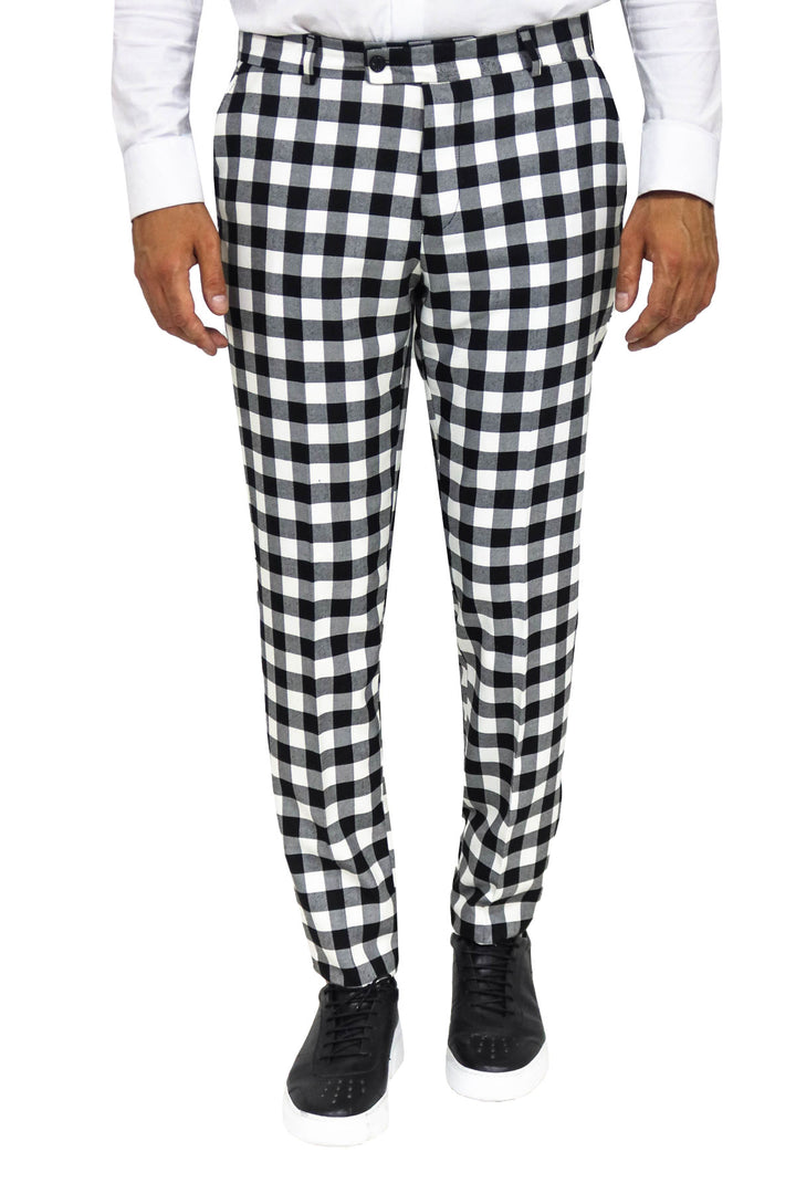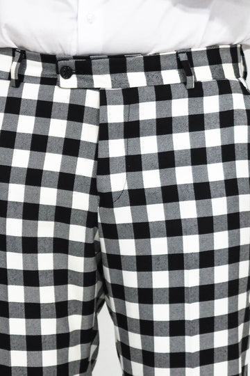 Plaid patterned pants allow men to express their clothing style in an original way. Plaid patterns in different colors offer options for every style and season. They are available in both classic cuts and more modern cuts. Representing elegance and refinement, these men's black checked slim-fit trousers are the perfect choice to stand out at receptions and special events. The black color and check pattern offer a sophisticated look and are a suitable choice for any occasion. Pair these black plaid trousers with a black basic shirt to create an elegant invitation look. You can complete the outfit by wearing a matching black blazer. You can emphasize the elegance by wearing black leather oxford shoes or loafers as shoes. You can complete your style by adding accessories such as a thin belt and a silver wristwatch. This outfit is suitable for all kinds of occasions, from weddings to private parties, and represents you in a glamorous way.