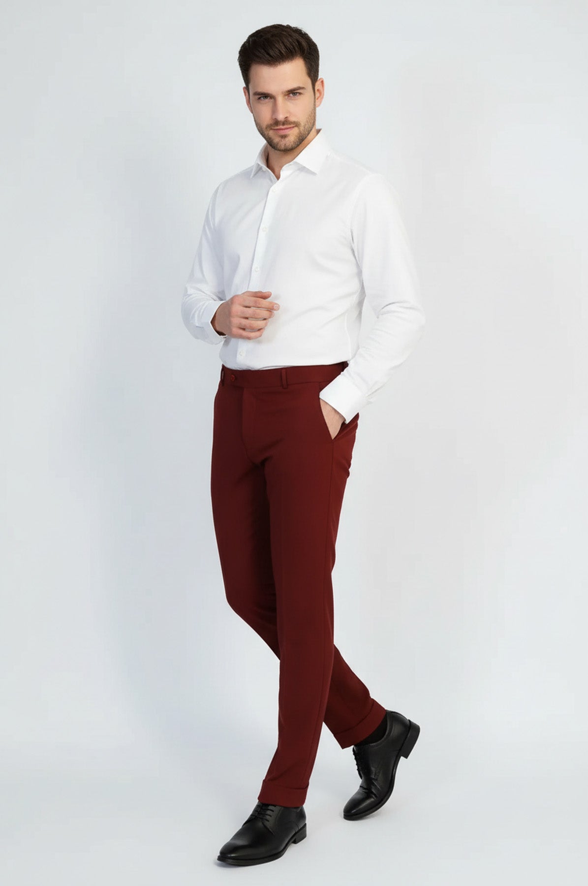 Fabric pants are special designs where men find elegance and comfort together. Thanks to high-quality fabrics and carefully designed details, you can feel comfort and elegance in every step. You can complete your style by choosing them for business life or special events. Burgundy patternless slim fit men's trousers stand out as a key piece that is a candidate to become an indispensable part of your wardrobe. With its patternless structure and rich burgundy color, these trousers add a sophisticated touch to your style by offering both a stylish and modern look. Pair them with a white t-shirt and a beige cardigan for a casual yet stylish look. For shoes, you can choose white sneakers or brown casual boots to complete the outfit. With its burgundy color and patternless structure, your outfit gains an eye-catching and comfortable air, while the cardigan and t-shirt combination brings your elegance to the forefront. You can create an original look by completing the combination with accessories suitable for your style.