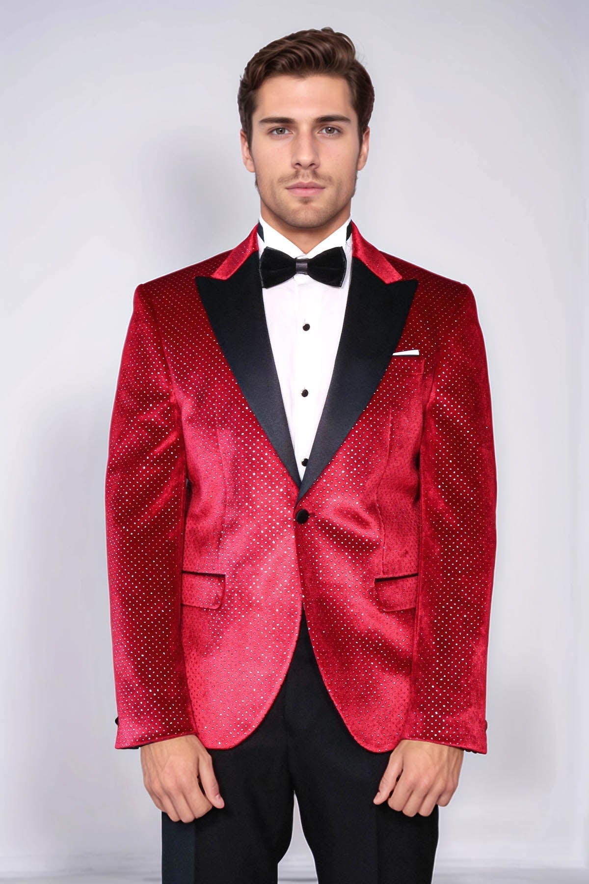 For men who want to make a bold yet sophisticated statement, the Wessi Sparkling Dotted Burgundy Tuxedo Jacket is the ultimate choice for standing out in style!
