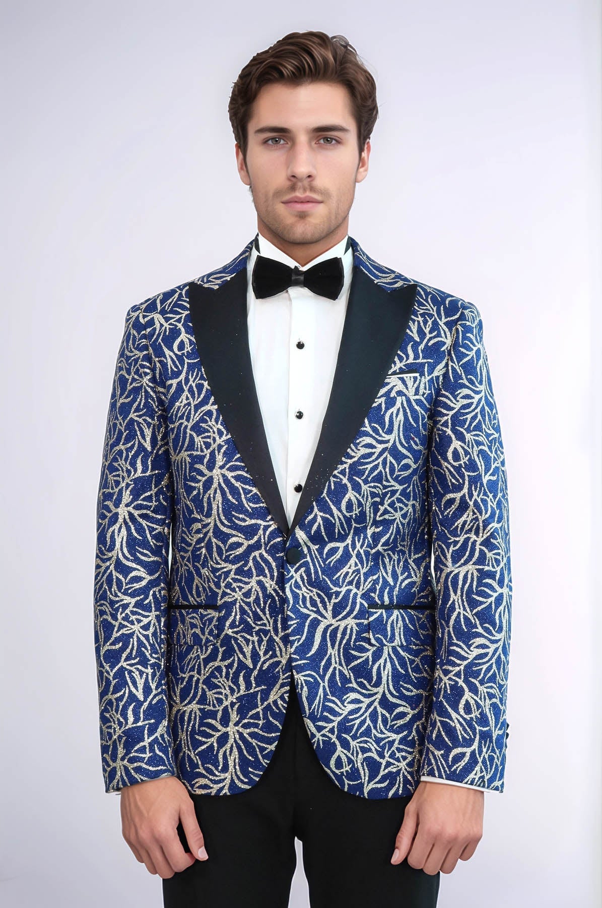 Sparkling Ivy Patterned Slim Fit Blue Men Evening Tuxedo Jacket - Wessi