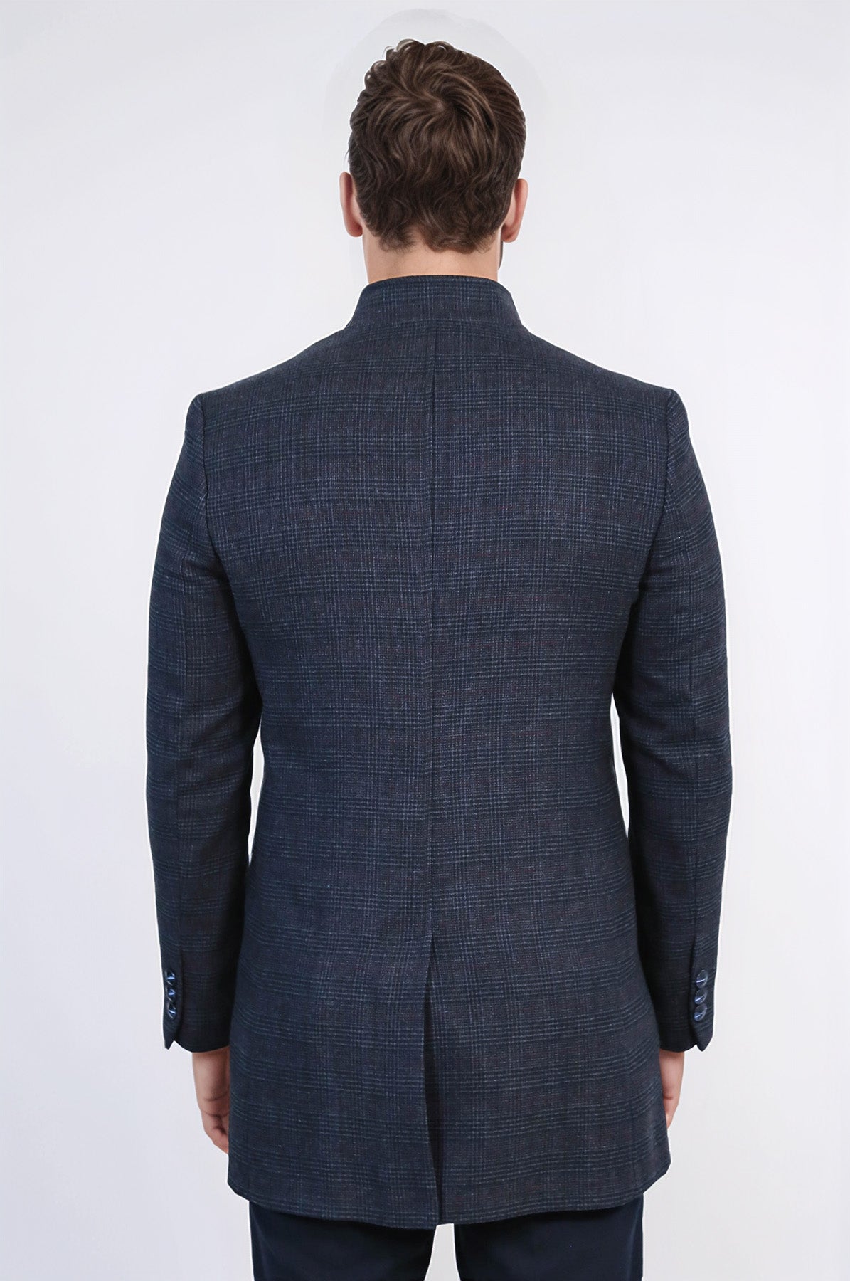Standing Collar Checked Navy Blue Men Coat - Wessi