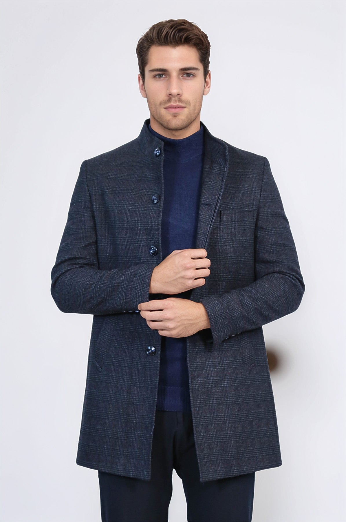 Introducing our stunning men's coat, the perfect addition to your wardrobe this autumn! This sleek and elegant coat is designed to make heads turn with its slim fit and timeless checked pattern. Made with meticulous attention to detail, this coat features hidden buttons for a seamless look and a standing collar that adds a touch of sophistication to your ensemble. The navy blue color exudes class and versatility, effortlessly complementing a variety of outfits. Pair it with a crisp white shirt, dark jeans, and brown leather shoes for a smart-casual look that's perfect for a business meeting or a dinner date. Or create a fashion-forward ensemble by layering the coat over a turtleneck burgundy sweater, slim-fit grey trousers, and Chelsea boots. Effortlessly chic, this outfit is ideal for a stylish weekend brunch or a day out with friends. Embrace the autumn season in style with our Navy Blue Slim Fit Checked Men's Coat. Its slimming silhouette, timeless design, and rich navy blue hue make it a must-have piece for any fashion-conscious man.