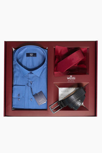 The Dapper Gift Box by Wessi – Includes Sky Blue Shirt, Burgundy Tie & Textured Black Belt