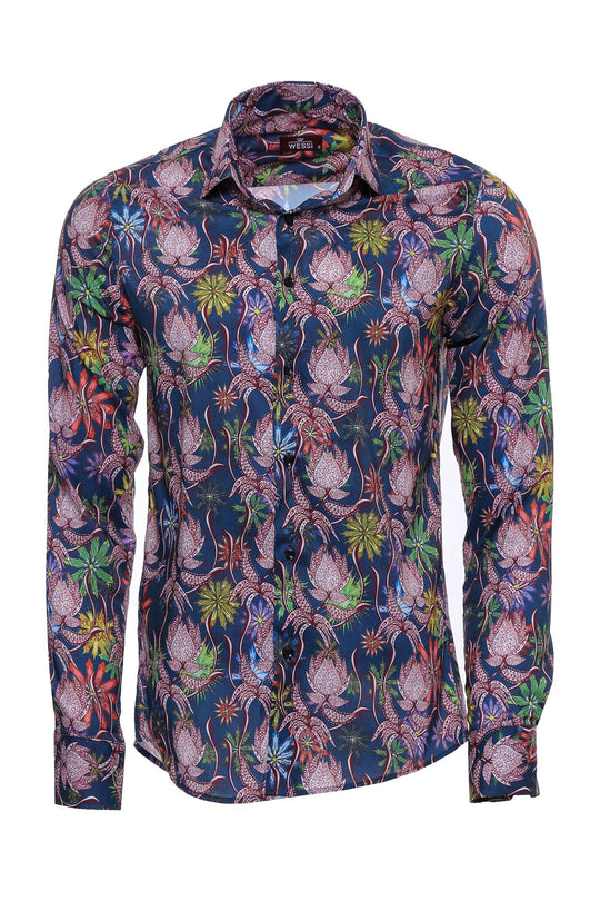 Tiger And Leaf Patterned Long Sleeves Slim Fit Blue Men Shirt - Wessi