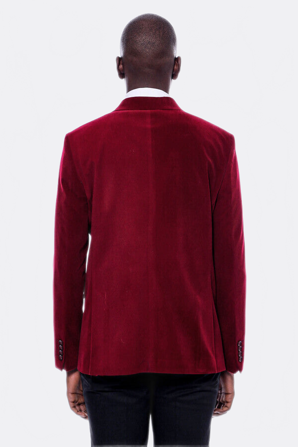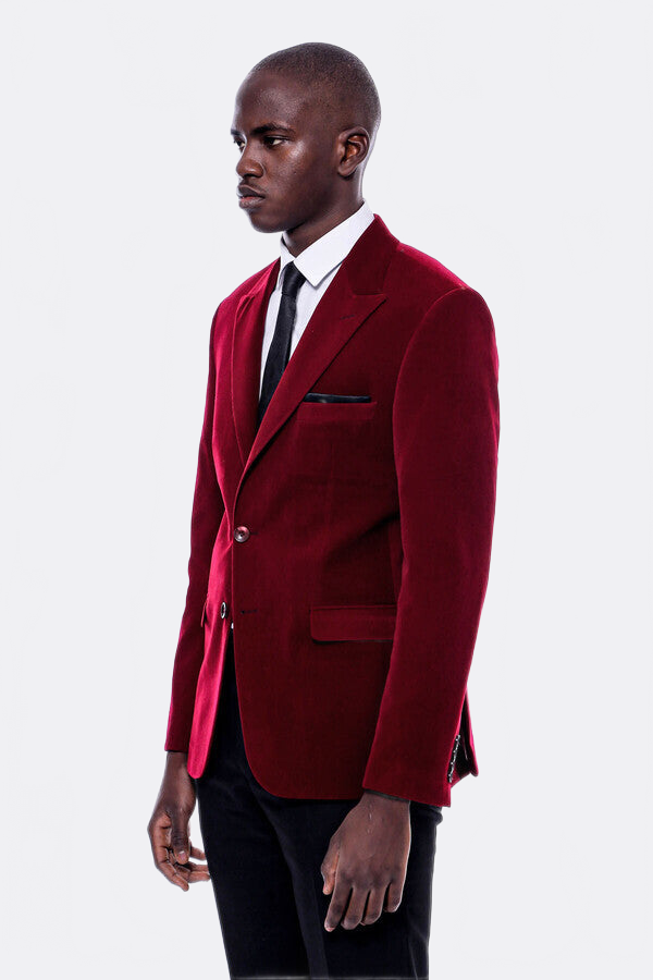 Wide Peak Lapel Velvet Burgundy Men Blazer - Wessi