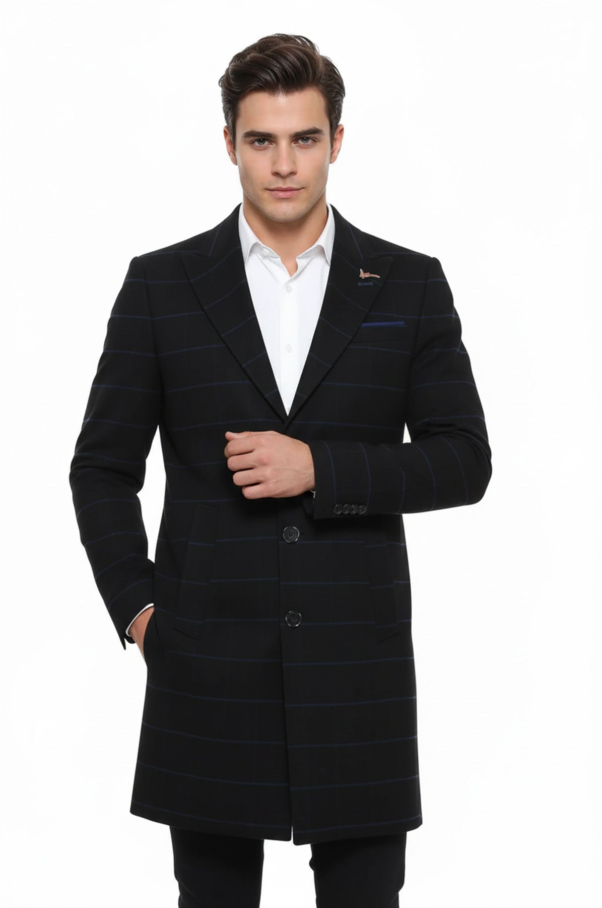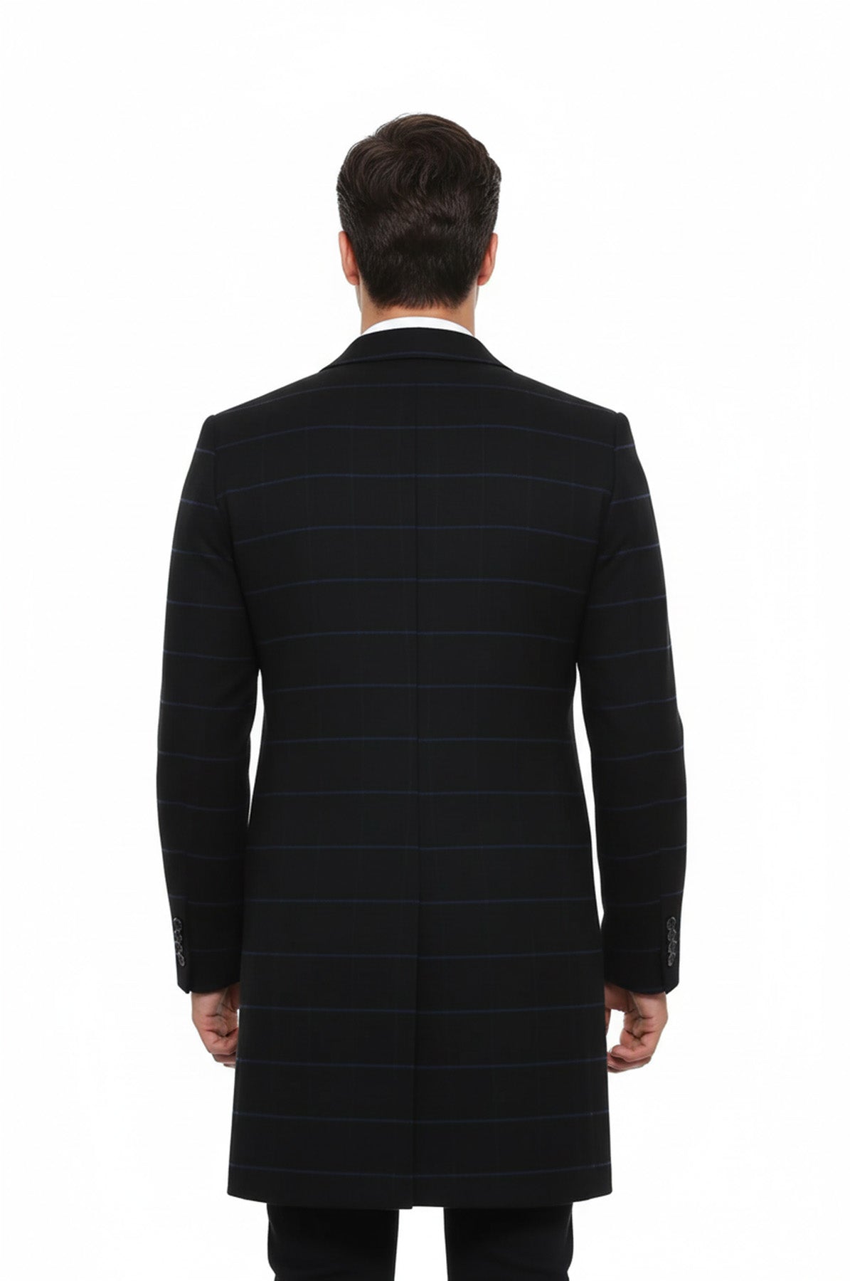 One of the outerwear products for men in winter, this model is a short coat. Coats have a beautiful appearance with their stylish, charismatic and cool postures. This black coat is a product that can be preferred for winter combinations. The pattern formed by the transverse blue lines on the black stamp fabric adds a modern touch to the coat. This coat model, which has three buttons, has three pockets. It is produced by using slim fit mold.