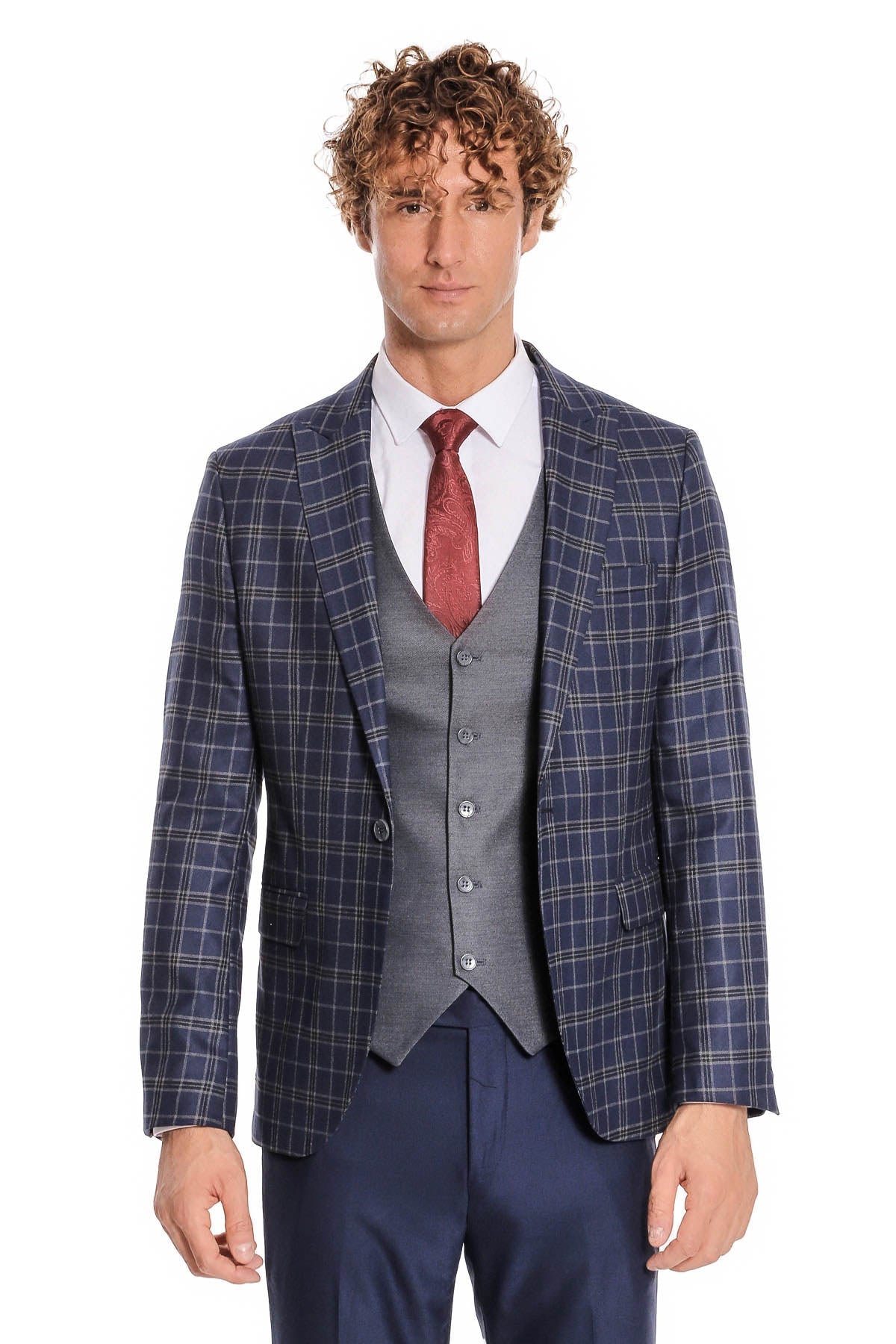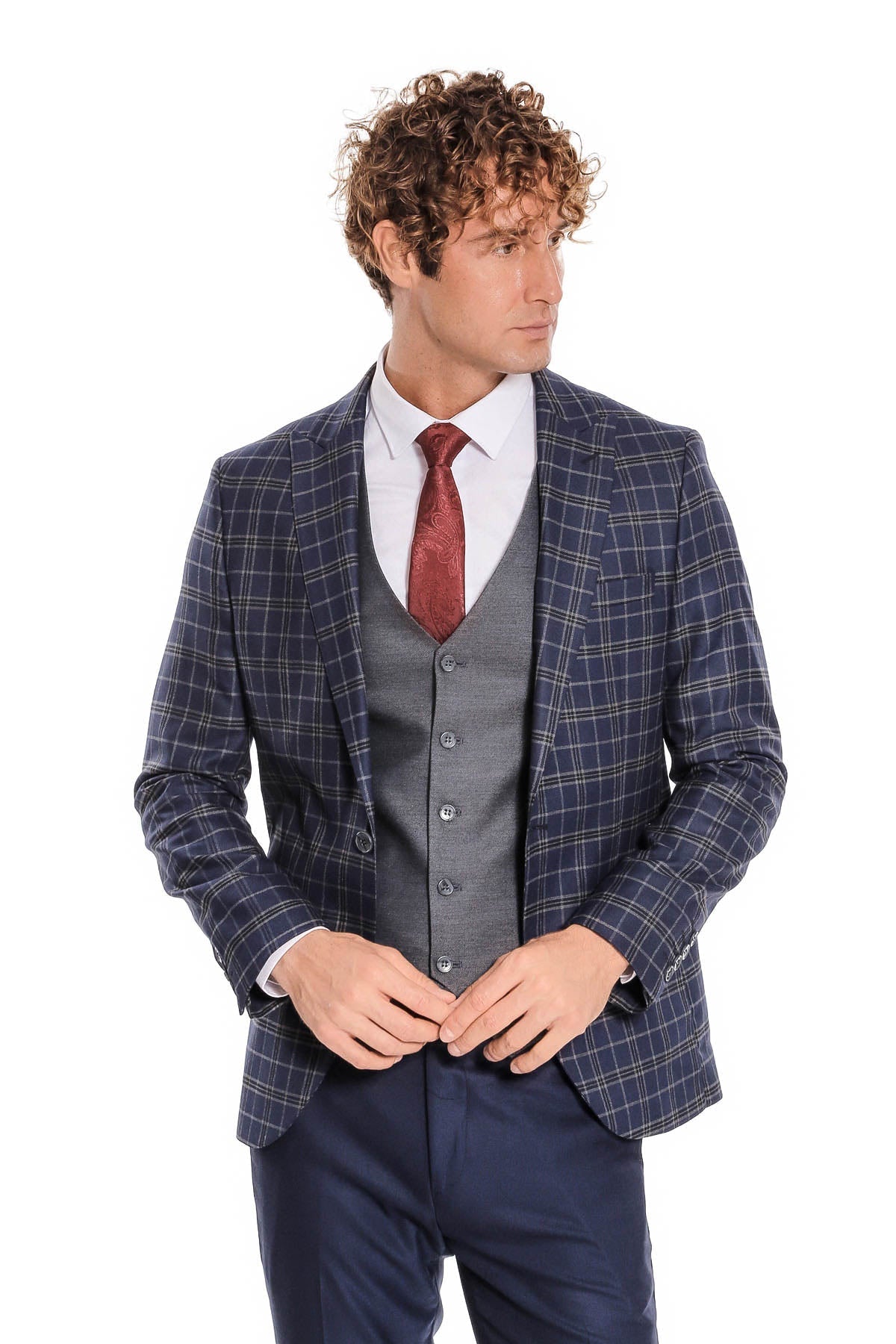❓ For which occasions is this navy plaid three-piece suit suitable?