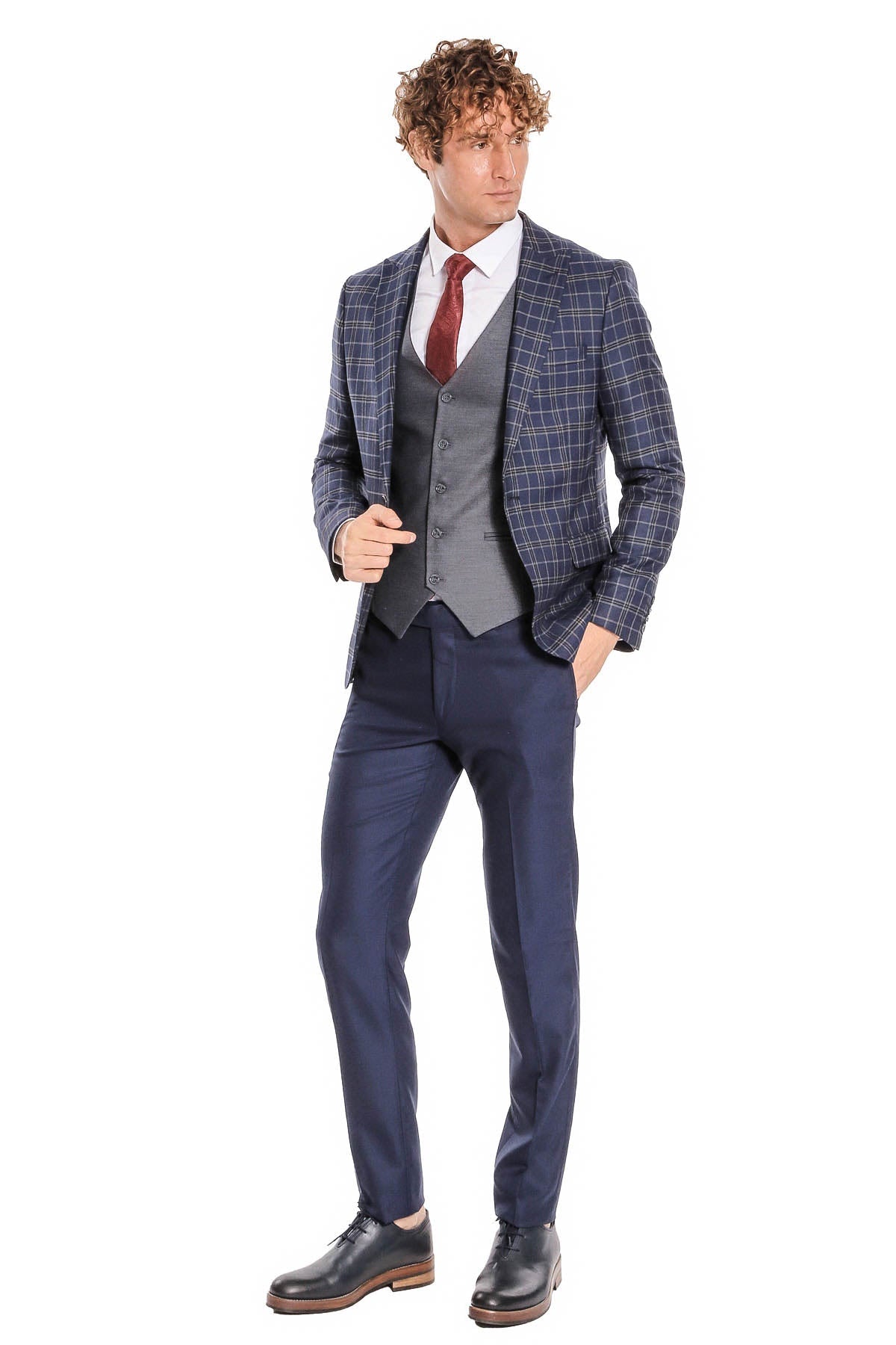 Синий мужской костюм в тонкую клетку темно-синего цвета с жилетом - Wessi