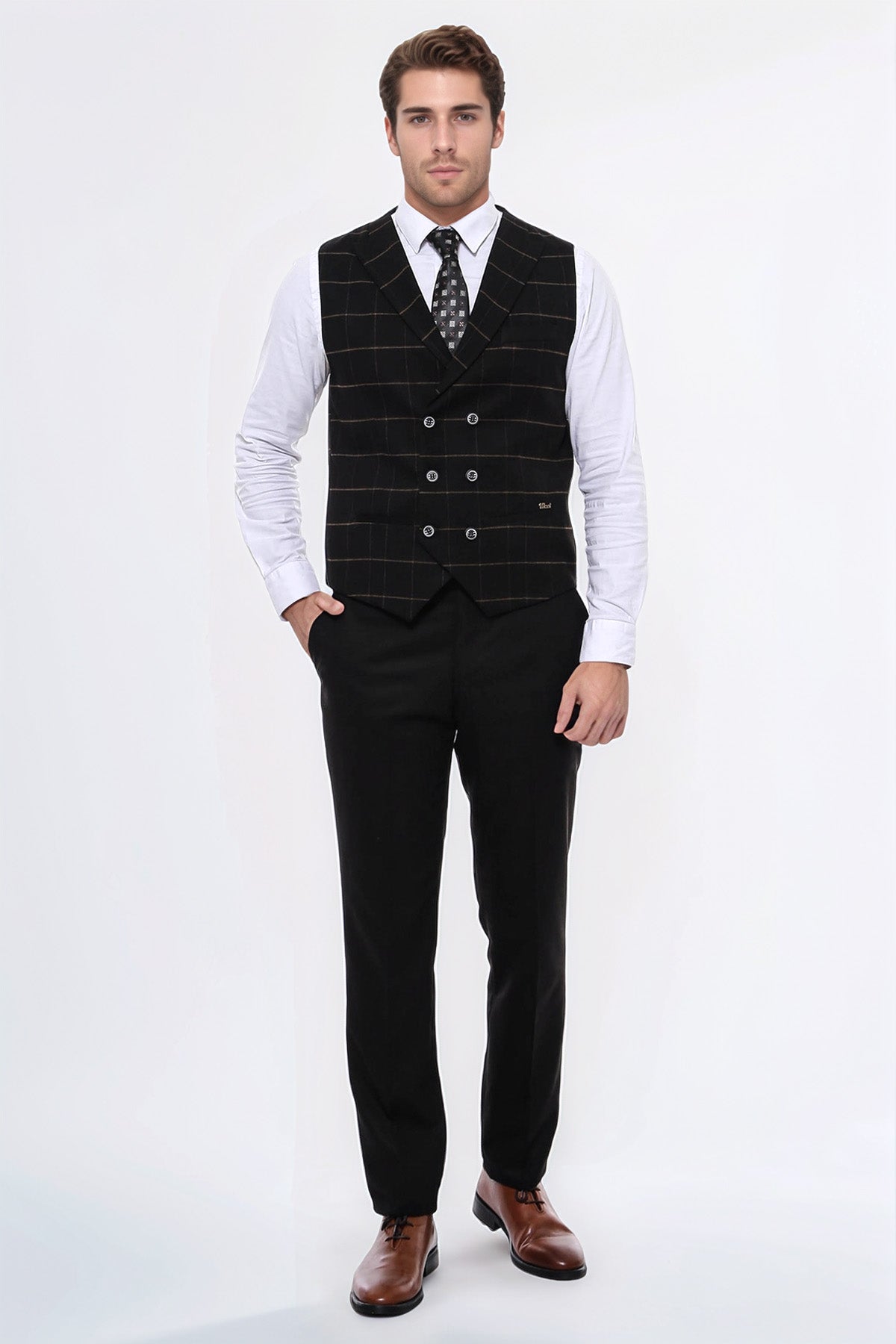 Жилетки – одна из незаменимых вещей в мужском гардеробе. Они идеально подходят как для работы, так и для повседневной носки. Мелкие строчки и качественные молнии обеспечивают долговечность и эстетику жилетов. Мы предлагаем отличный вариант, который дополнит вашу повседневную элегантность и стиль: мужской черный двубортный жилет приталенного кроя в клетку. Этот жилет — универсальная вещь, сочетающая элегантность и комфорт в повседневной жизни. Черный цвет создает классический и изысканный стиль, а клетчатый узор делает жилет особенным. Двубортный дизайн придает жилету характерный вид. Сочетайте этот черный жилет с белой или светлой рубашкой и соответствующими брюками, чтобы создать шикарный повседневный образ. Кожаные туфли или лоферы и ремень в тон помогут завершить образ. Легкий галстук или нагрудный платок придадут образу изысканности. Этот жилет предлагает элегантность и комфорт в повседневной жизни. Закажите этот жилет сейчас и улучшите свой повседневный шик!