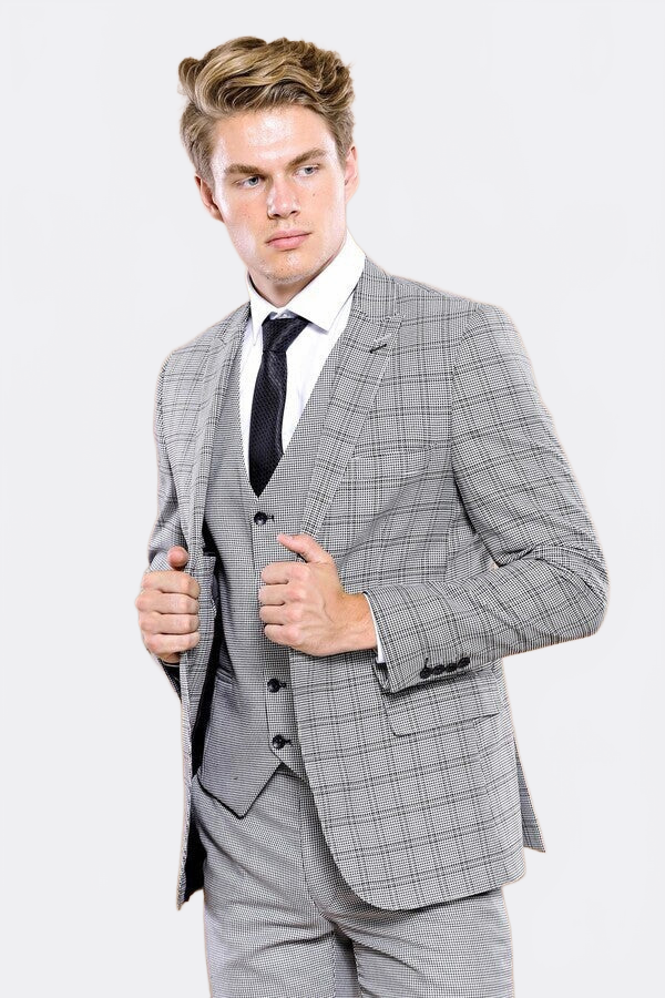 Серый тройной костюм-комбинация очень стильный: клетчатый пиджак, небольшая клетчатая жилетка и удобные брюки. Эта команда входит в число предпочтений джентльмена, который хочет быть стильным в любое время на рабочем месте, деловых обедах и специальных приглашениях. У вас будет харизматическая позиция, на которую вы будете обращать внимание. Облегающий крой, брюки удобного кроя, удобные карманы и сочетание качества и стильного командного предложения.
