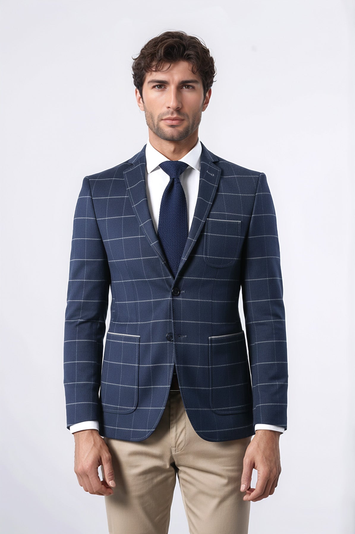 A: Its slim fit cut with modern windowpane checks adds elegance and a contemporary edge.