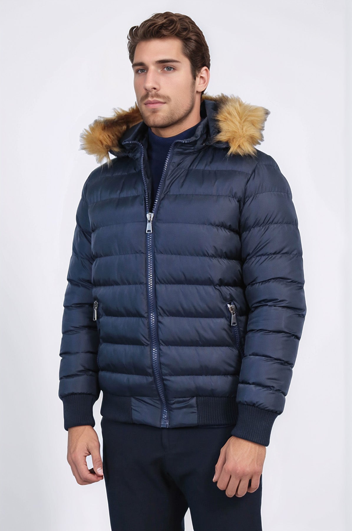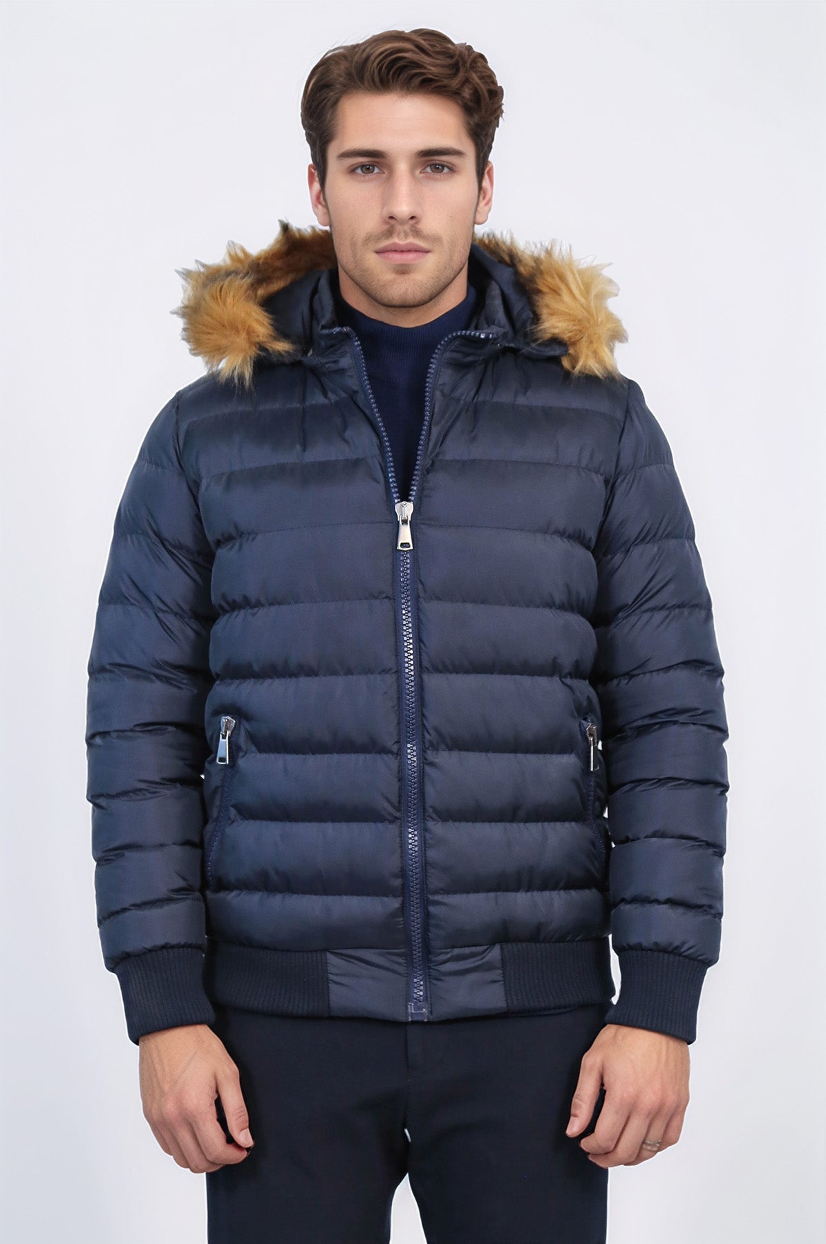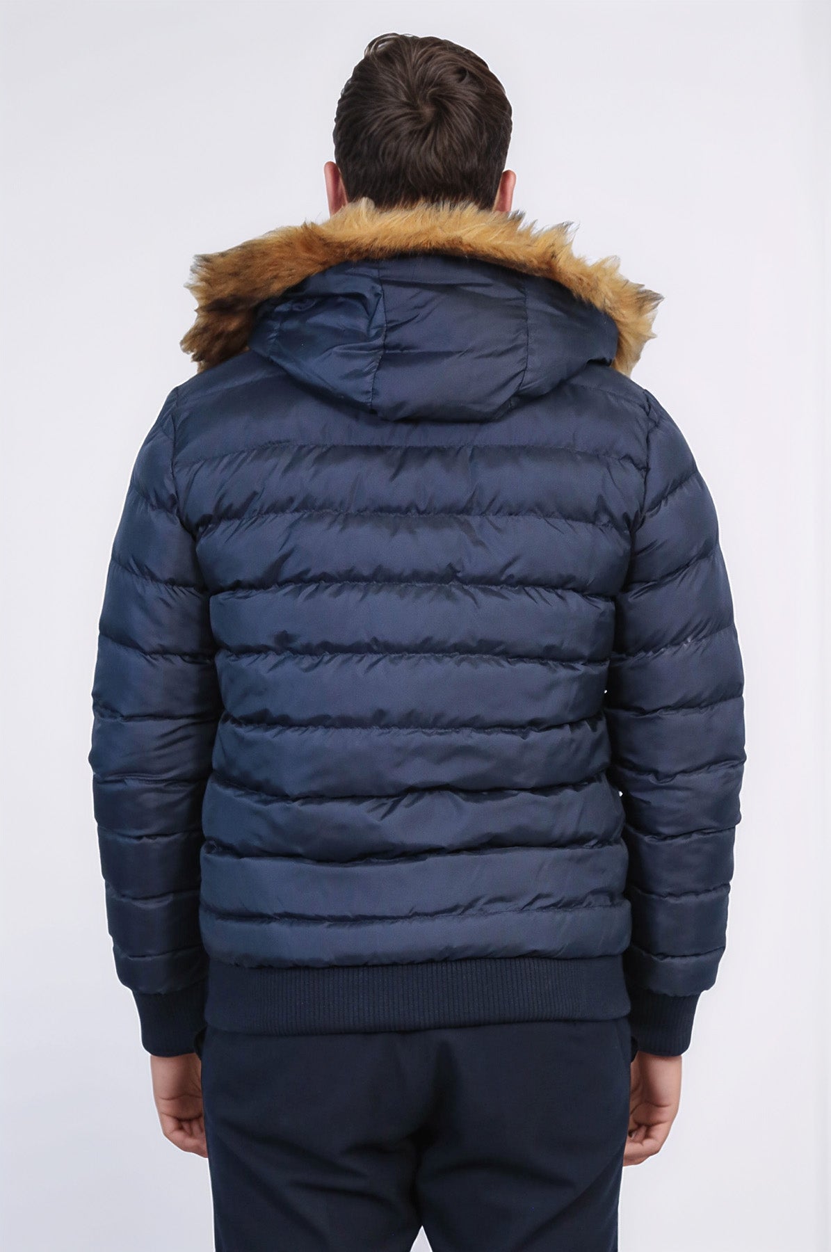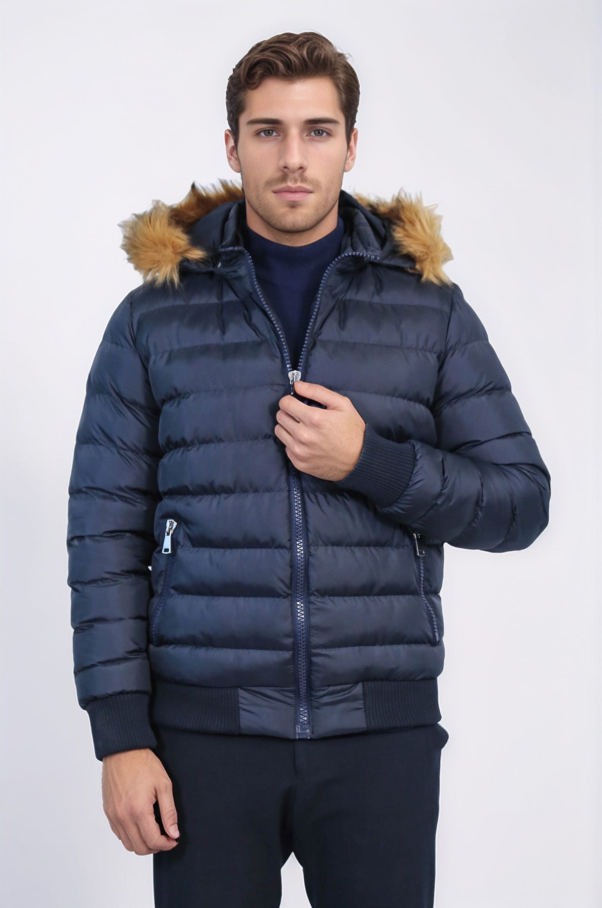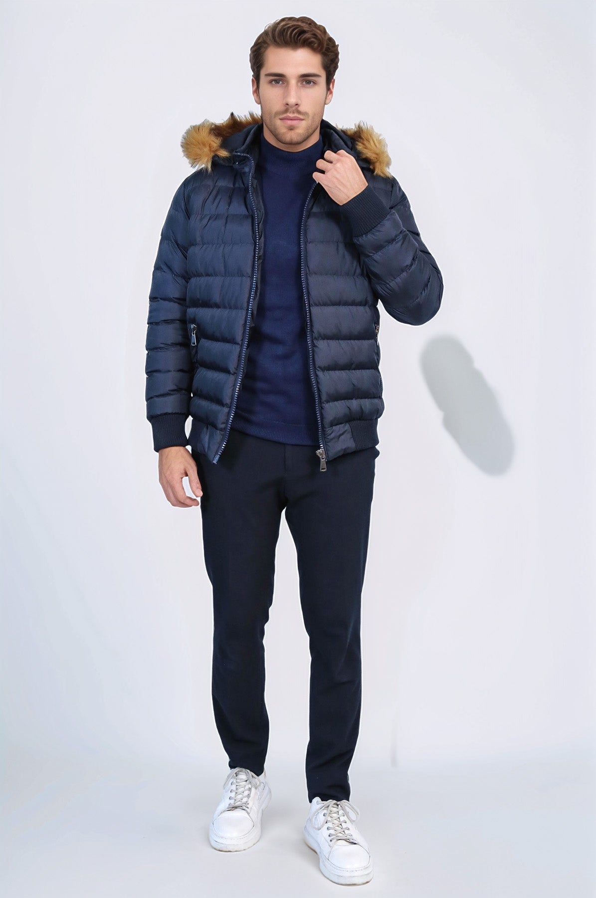 Мужское зимнее пальто-пуховик приталенного кроя со стеганым меховым капюшоном выполнено из полиэстера темно-синего цвета. В этой модели, сочетающей в себе облегающий крой и надувную куртку, которая является одной из незаменимых тенденций последних лет, мех, дополненный деталями, создает особый стиль. Надувные куртки темно-синего цвета с карманами на молнии покорят сердца любителей спортивного стиля. Эта модель представляет собой надувное пальто, которое может легко носить каждый, поскольку его длина заканчивается на уровне пояса. Благодаря своему темно-синему цвету оно также используется во всех видах комби.