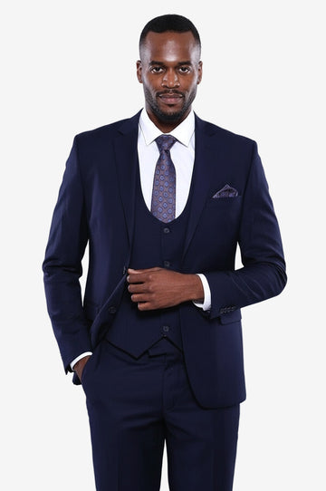 ❓ What style does this navy blue suit offer?