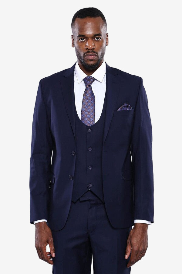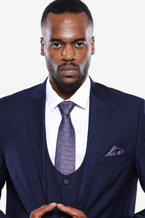 ✔️ The slim-fit cut, single-button jacket, and matching vest provide a modern silhouette. A patterned tie and pocket square add refined contrast to the solid navy base.