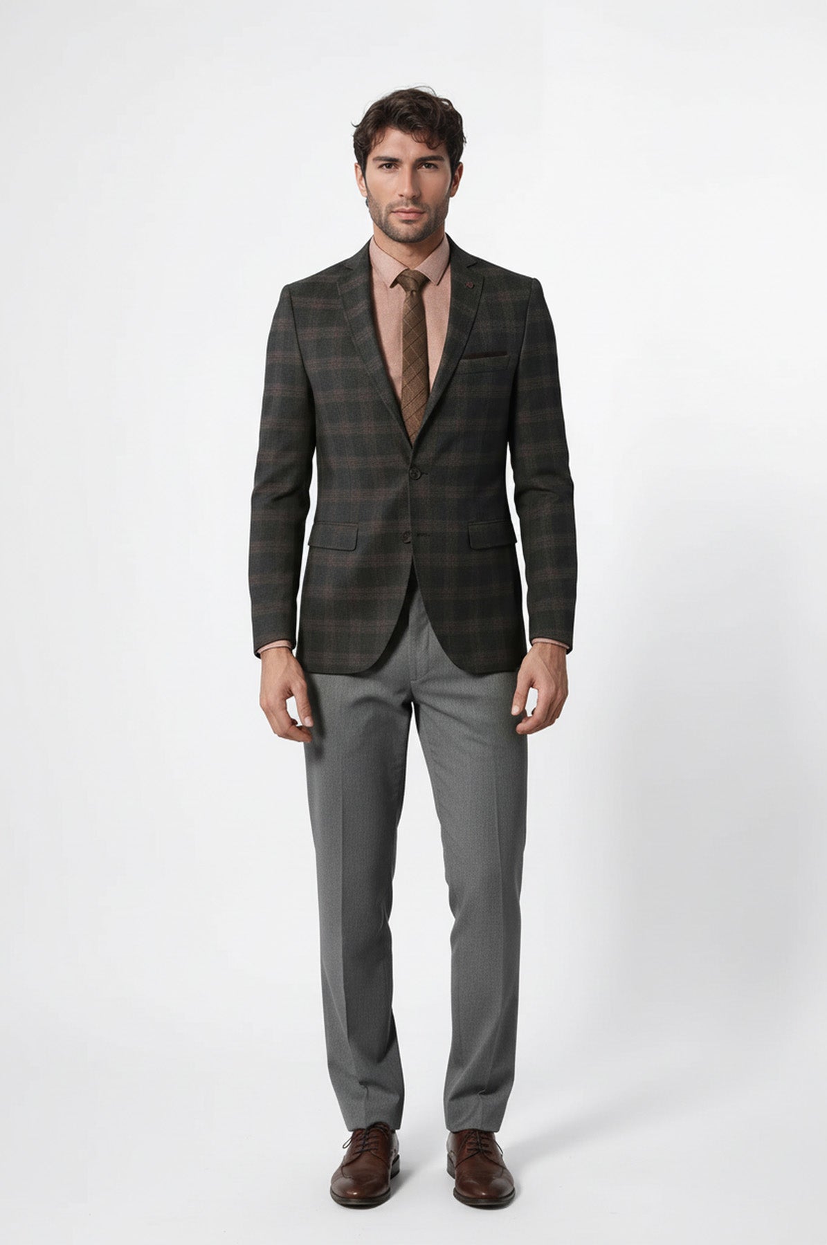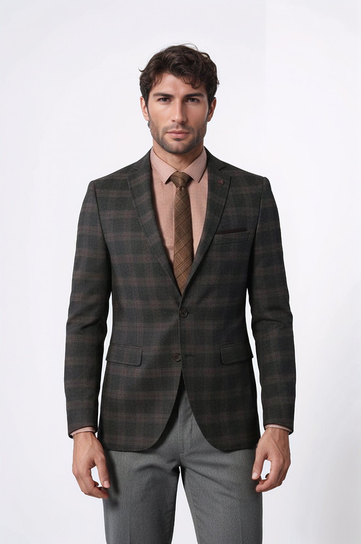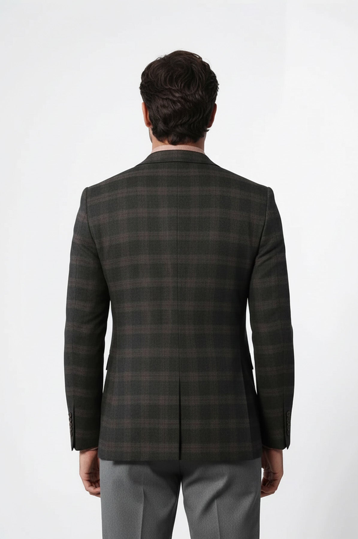 Дизайн: заостренный лацкан, две пуговицы, 6 капель, клетка, двойные шлицы.