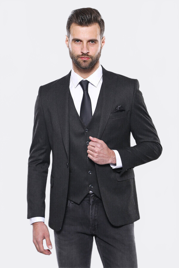 Детали: пиджак с острыми лацканами, жилет с V-образным вырезом, двойные шлицы,