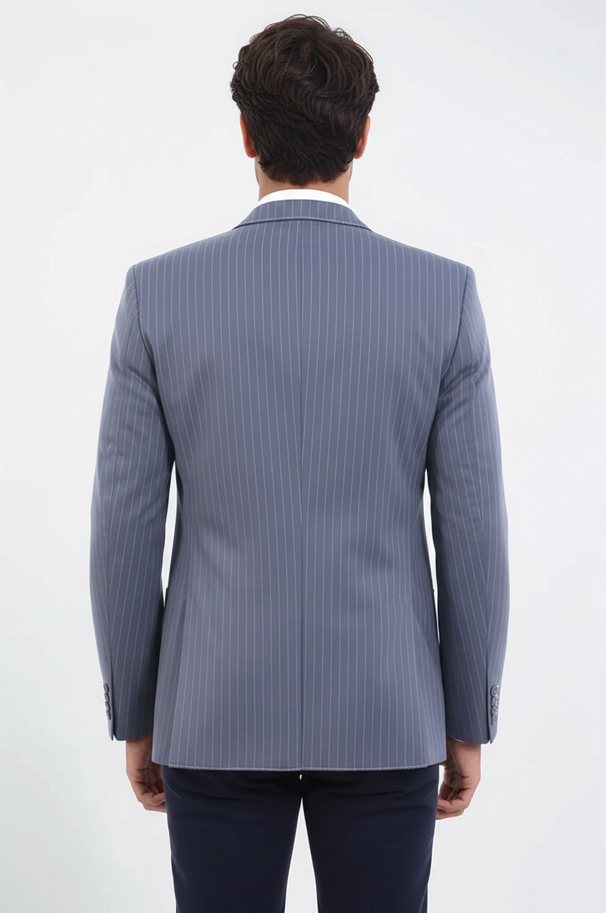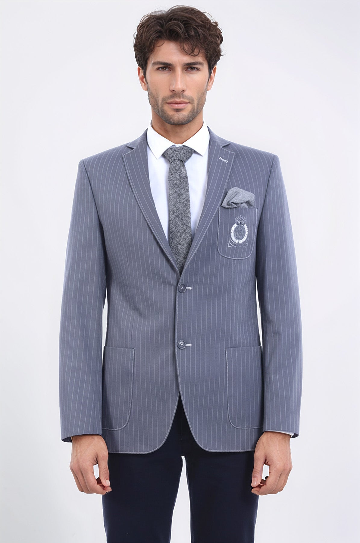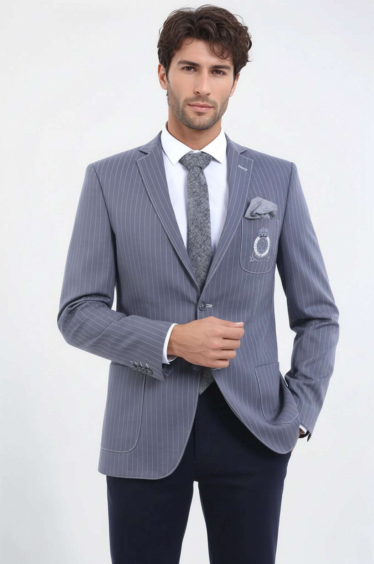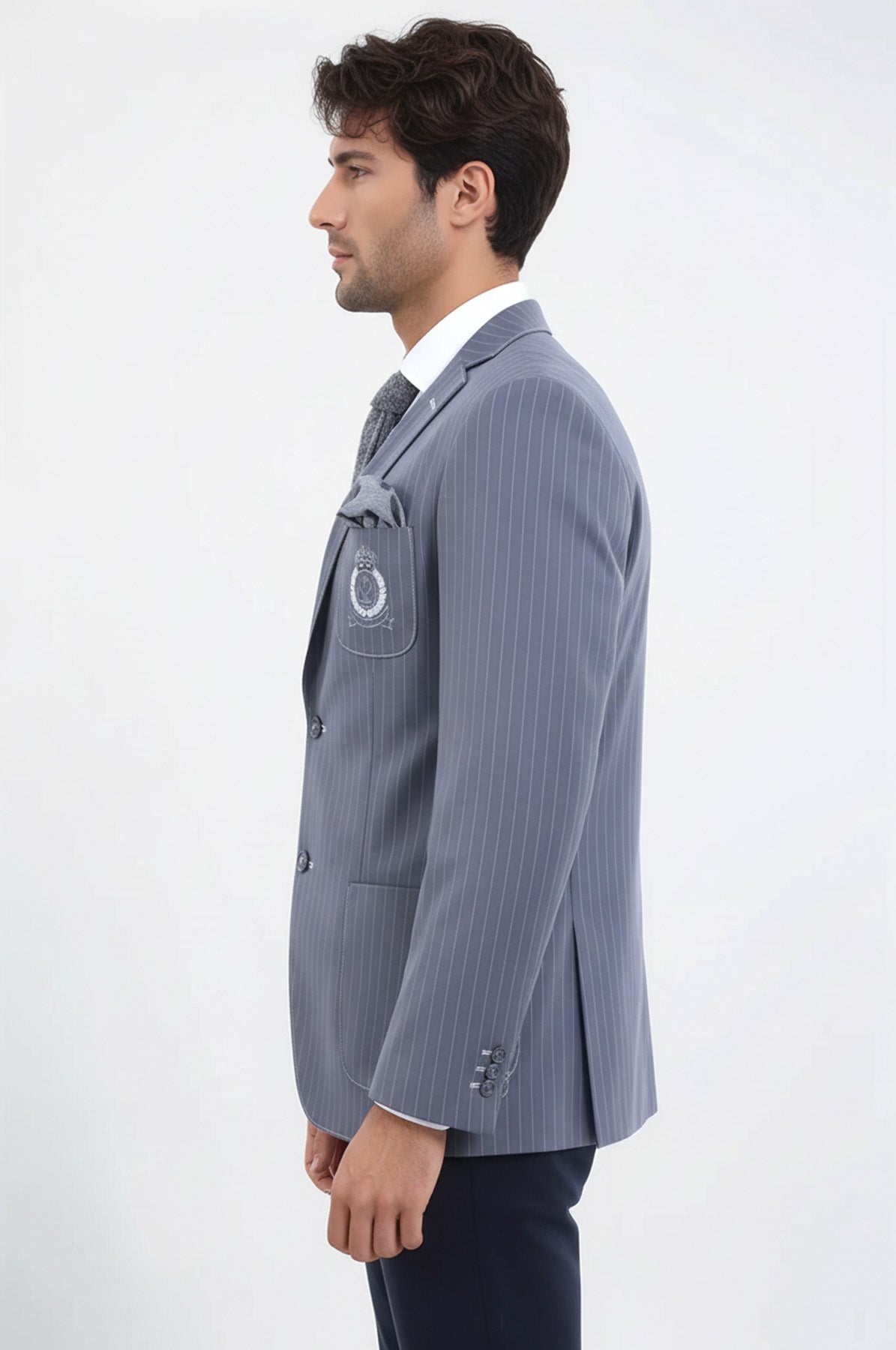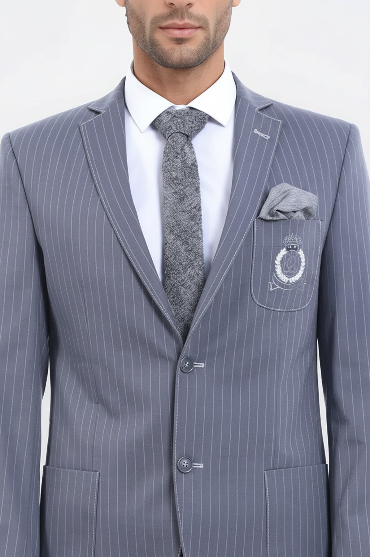 A: The fine pinstripe pattern with a crest detail on the chest pocket adds both classic elegance and a touch of uniqueness.